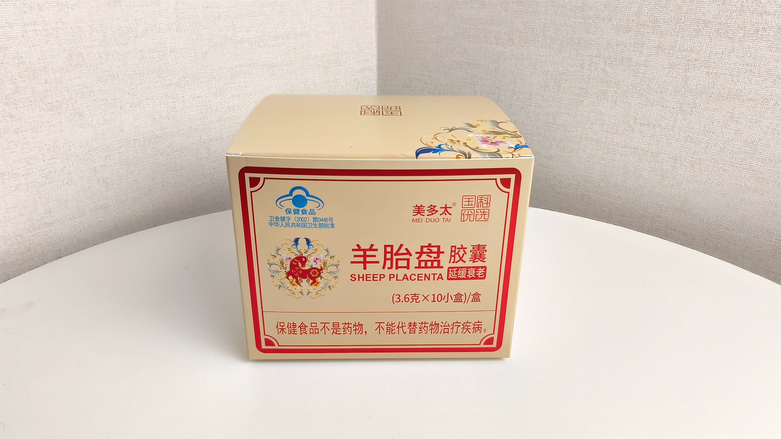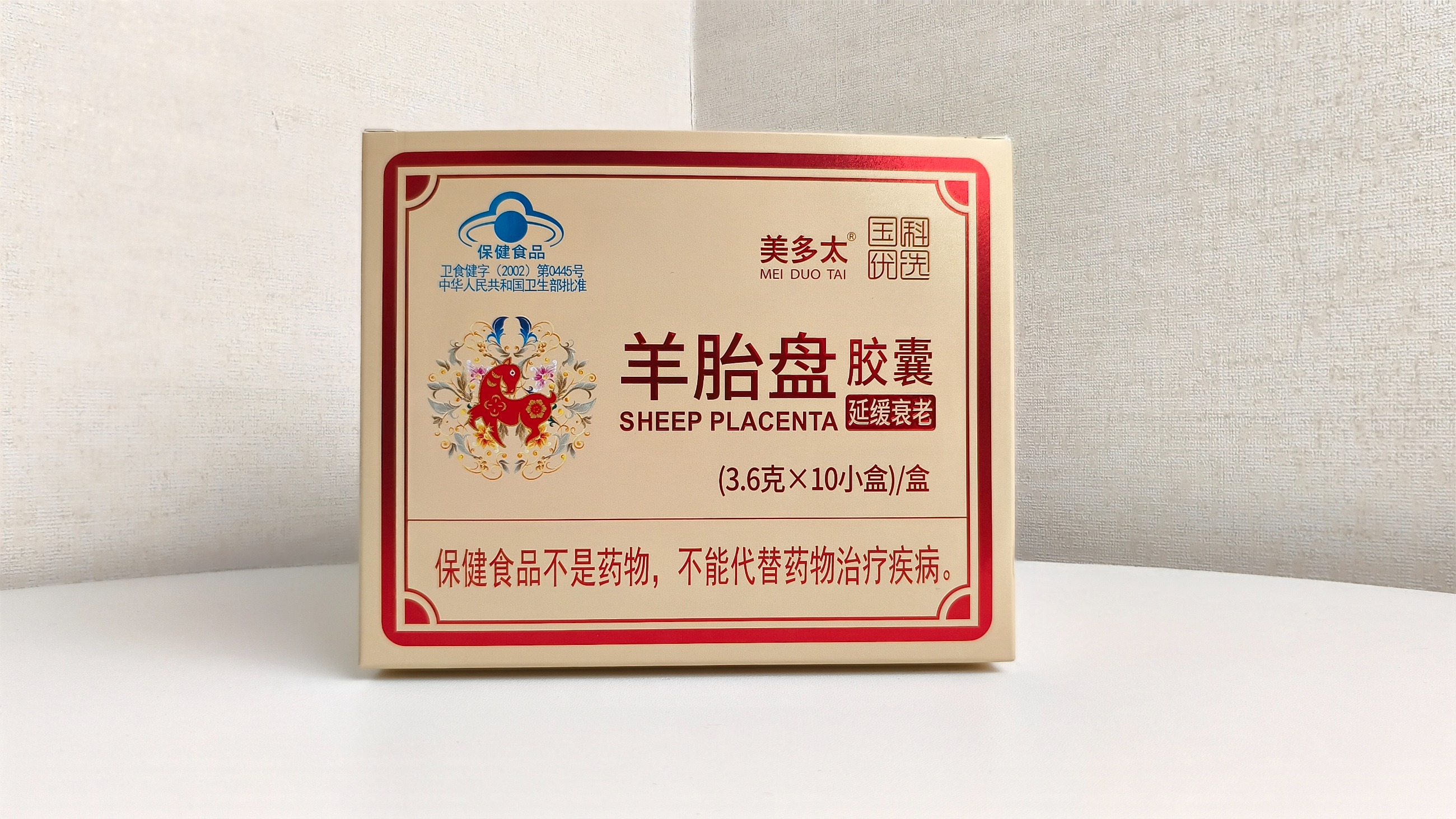 本品是以羊胎盤(pán)、淫羊藿、菊花、紅花為主要原料制成的保健食品,經(jīng)功能試驗(yàn)證明,具有延緩衰老的保健功能
